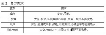一個好的太陽能熱水系統(tǒng)需要達到用戶、開發(fā)商、政府、物業(yè)管理四方滿意。 各方的需求不一樣,太陽能熱水系統(tǒng)的各方需求(見表2)。